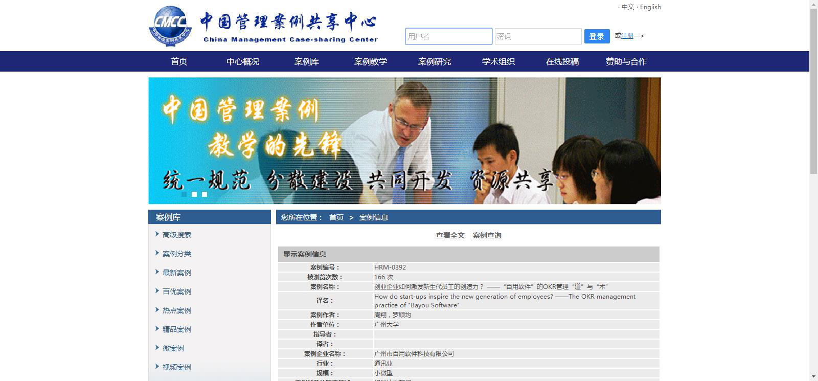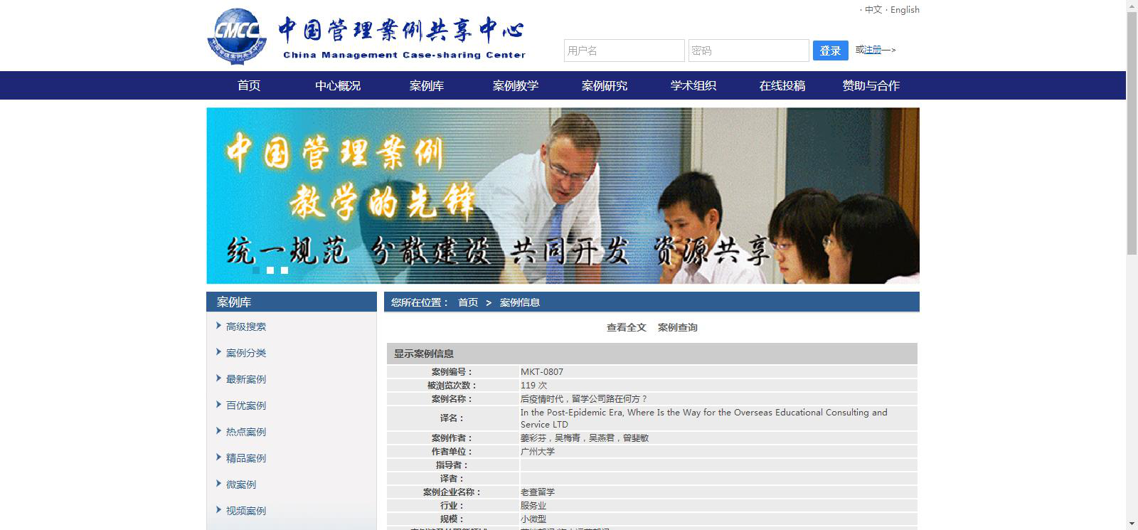中国管理案例共享中心是在全国工商管理专业学位研究生教育指导委员会的支持下成立的服务性和非盈利合作机构。中国管理案例共享中心以“统一规范、分散建设,共同参与、资源共享” 为宗旨,致力于建立为中国MBA培养院校服务的管理案例开发建设与使用的共享网络。中心实行会员制,各批次MBA培养院校均为会员,现有会员单位279所高校。案例共享中心所有的共享案例均免费提供给会员院校使用。