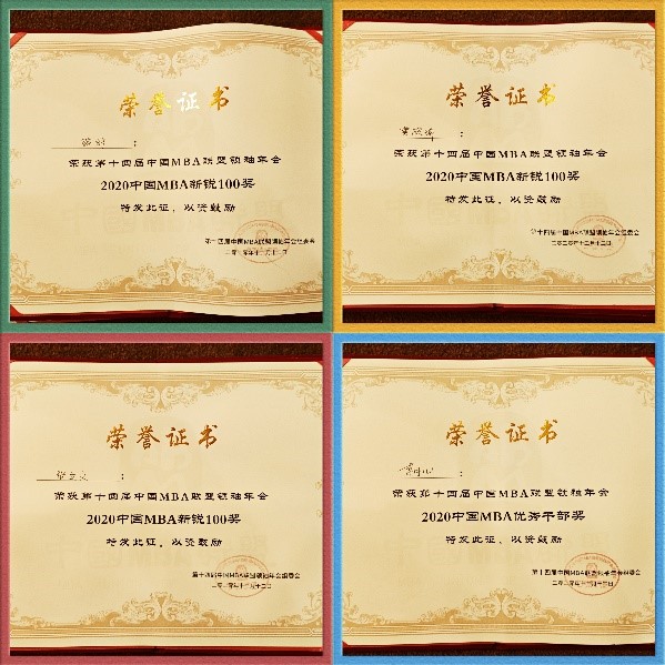 2019级李月儿同学荣获“2020中国MBA优秀干部奖”,2019级骆婷同学、2020级张立文同学和2020级黄欣瑜同学荣获“2020中国MBA新锐100奖”。