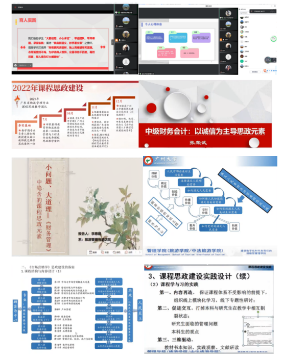 7位老师进行了主题发言,其中,工程管理系袁红平老师以示范课程《项目管理》和优秀案例为例,阐述了情景设计下的课程思政教学思路;电子商务系胡勇军老师运用“四循环”协同育人方法分析了管理类大数据分析的课程思政教学方法;物流管理系田泉老师不仅讲解了示范课程《生产运作管理》的课程思政教学方法,还分享了物流管理专业的课程思政建设思路;人力与市场营销系杨华老师讨论了数智化时代市场营销专业课程思政建设情况,并以《市场营销学》为例分析了专业课程思政的思路与措施;旅游与酒店管理系李惠娟老师从“小问题、大道理”的角度,讨论了《财务管理》中隐含的课程思政元素融入问题;会计系张荣武老师强调课程思政的价值观念,以《中级财务会计》为例,分析了以诚信为主导思政元素融入的思路与案例;创新与战略系孙丽君老师分享了《组织行为学》课程思政建设的心路历程与实践。