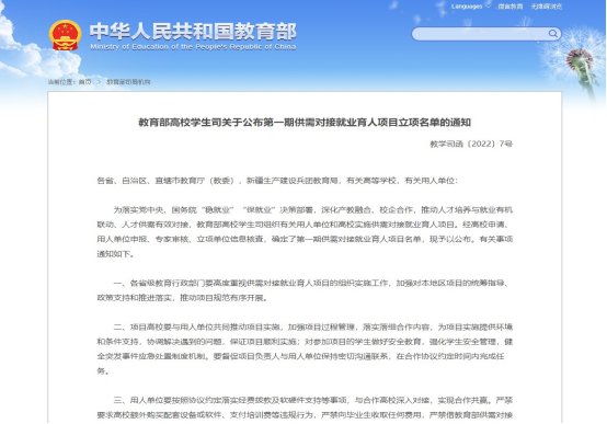 2022年4月6日下午,《教育部高校学生司关于公布第一期供需对接就业育人项目立项名单的通知》(教学司函〔2022〕7号)公布,教育部供需对接就业育人项目正式立项。成人短视频