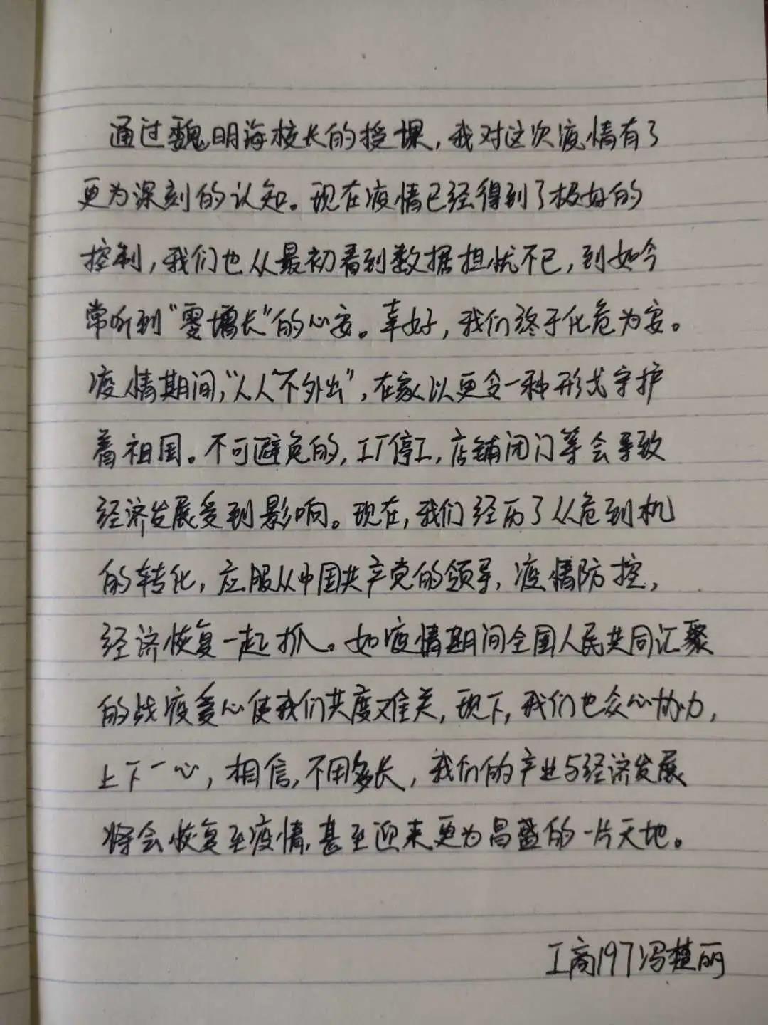 相信听课的同学都学到了不少,希望同学们能将校长的教诲与忠告牢记于心,不负校长的期望,既要做到按时上课不缺勤不迟到不早退学好专业知识,也要做到不限于课堂,在疫情中学会读懂社会,学会向社会学习,成长为有理想、有本领、有担当的新时代青年。