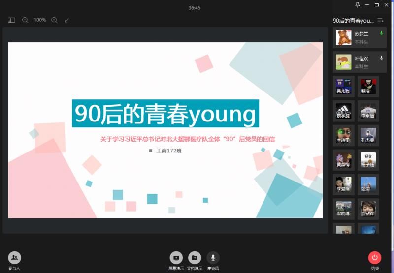 66个团支部共2556名学生(含研究生)通过企业微信、腾讯会议、易班等多种线上平台组织全院学生开展政治学习,学习习近平总书记给北京大学援鄂医疗队全体“90后”党员的回信。与此同时,成人短视频