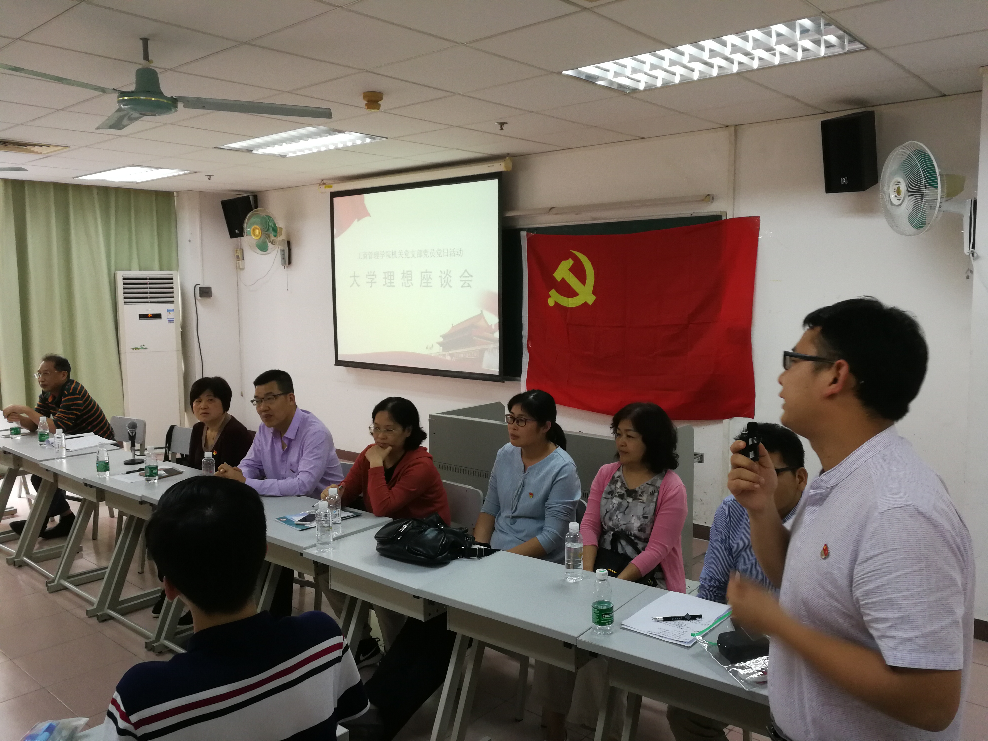 机关党支部全体党员赴桂花岗校区,在5号楼北602教室,跟大一学生代表开展以“大学是用来拼搏和奋斗”为主题的大学理想座谈会,机关党支部全体8名党员和桂花岗校区学生代表54人齐聚一堂,座谈会由机关党支部书记徐昕同志主持,各位党员相继发言。