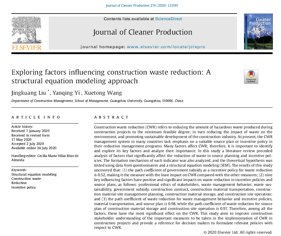 刘景矿副教授以第一和通讯作者身份发表了题为“Exploring factors influencing construction waste reduction: A structural equation modeling approach”(建筑废弃物减量化影响机理研究:基于结构方程的途径)的研究成果。该论文发表于工程和环境领域国际知名期刊《Journal of Cleaner Production》,期刊最新影响因子为7.246,在工程和环境(ENGINEERING, ENVIRONMENTAL)领域中排名第8,在绿色、可持续科学和技术(GREEN & SUSTAINABLE SCIENCE & TECHNOLOGY)领域中排名第6,是JCR一区和中国科成人短视频